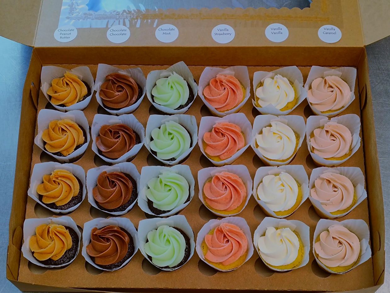 Our 24 mini variety pack is a party favorite and gives you 6 flavors of your choice with the best buttercream icing! Pictured above with 12 chocolate cakes; 4 each with peanut butter icing, chocolate icing, and mint icing. And 12 vanilla cupcakes; 4 each with vanilla icing, strawberry icing, and salted caramel icing. $26